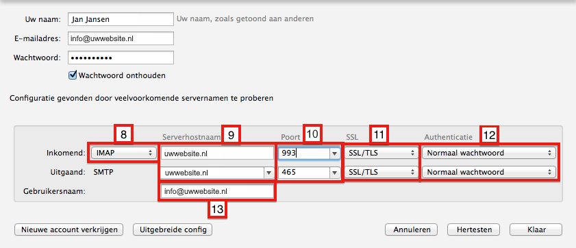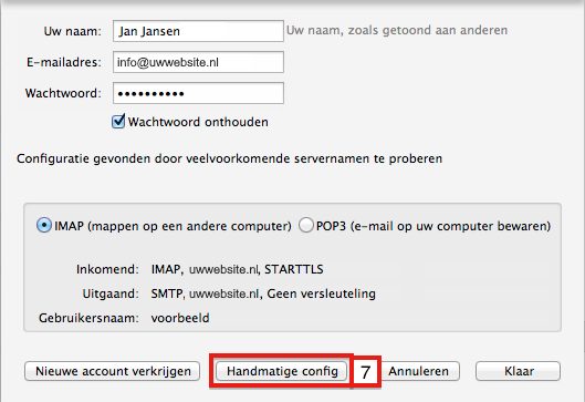 Selecteer IMAP. - Bij Serverhostnaam vul bij Inkomend en Uitgaand uw website in (bijv. uwwebsite.nl).