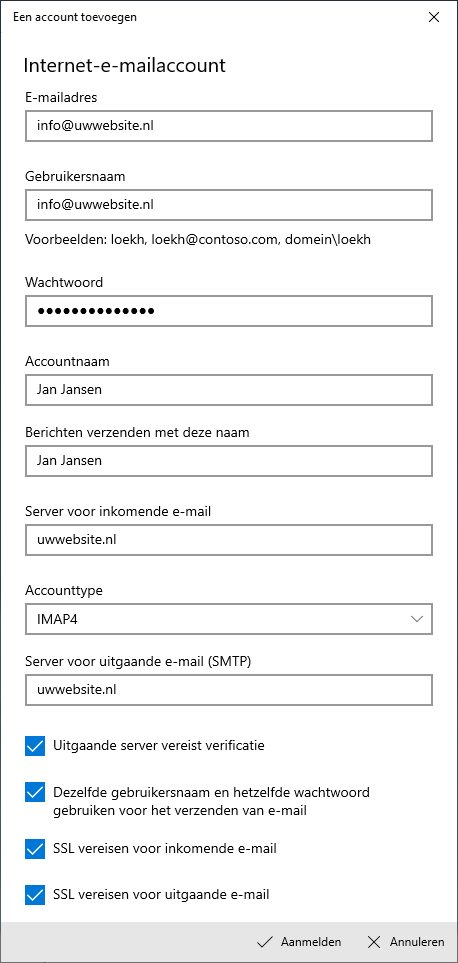 Server voor uitgaande e-mail (SMTP): uw domeinnaam (bijv. uwwebsite.nl)