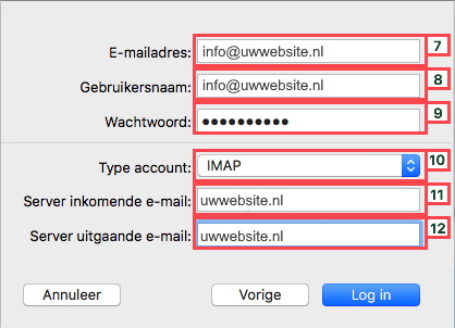 - Vul bij Server inkomende e-mail uw website in (bijv. uwwebsite.nl).